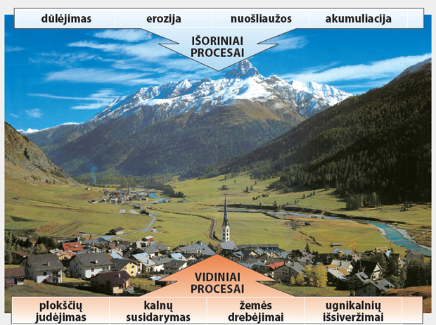 Išoriniai procesai susiję su vėjo ir vandens darbu, ledynų judėjimu. Per tūkstančius, milijonus metų vidinių ir išorinių procesų veikiamas mūsų planetos paviršius nuolat keičiasi.