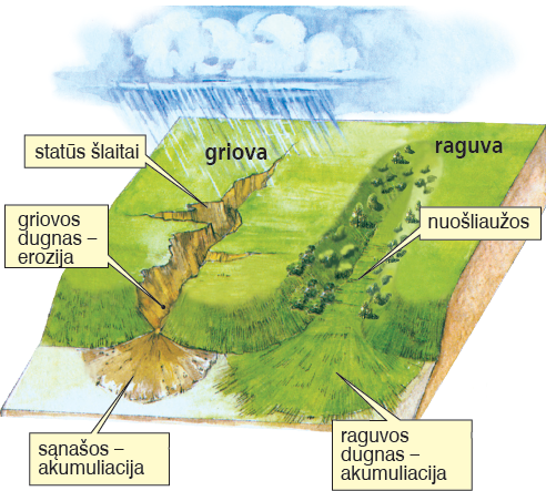 Dalis iškritusio vandens susigeria į žemę arba nuteka. Lietaus ir tirpstančio sniego vanduo nuplauna ir į kitą vietą nuneša smulkiausias uolienų daleles. Ypač lengvai nuplaunami menką augaliją apaugę kalvų šlaitai. Tokiose vietose kartais susidaro griovų. Po smarkių liūčių jomis garma drumzlinas vandens srautas. Jis neša purvą ir dumblą, kuris kaupiasi griovos papėdėje.
