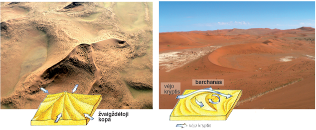 Tose vietose, kur labai daug smėlio, susiformuoja kopos. Kai kurios panašios į pasagą ir vadinamos barchanais. Šių kopų ragai rodo vėjo pūtimo kryptį. Besikeičiantys vėjai suformuoja kopų, kurios savo išvaizda primena žvaigždes.