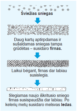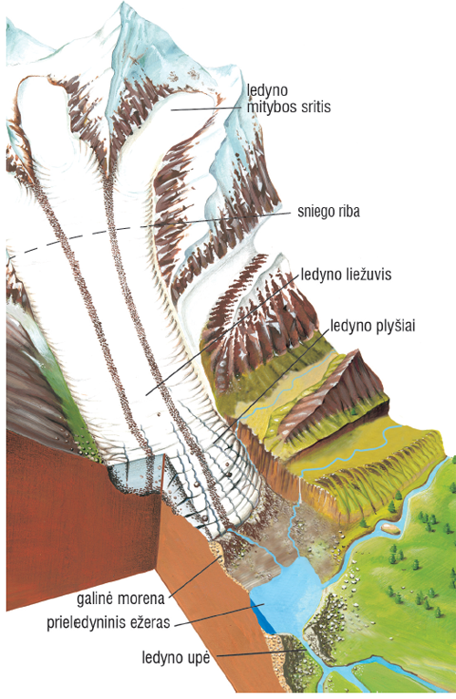 Besikaupiantis sniegas po truputį kietėja ir tampa tikru ledu. Kalnų ledynai gali būti įvairių formų. Vadinamieji ledyno liežuviai toli įsiterpia į Alpių slėnius.