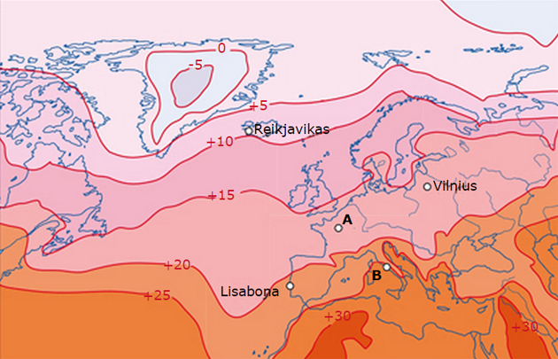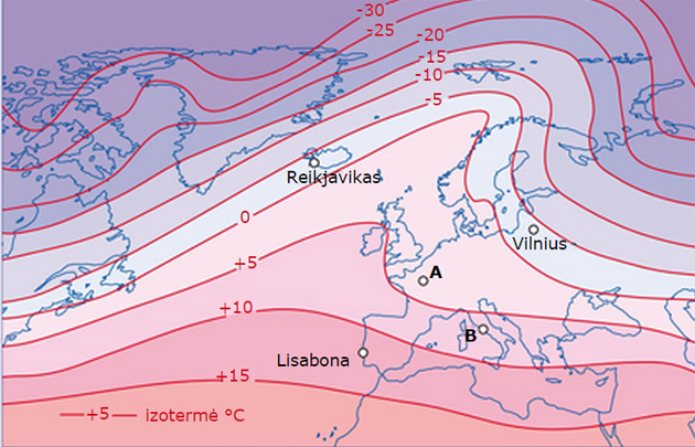 Temperatūros skirtumus žemėlapyje rodo izotermos. Tai linijos, kurios vaizduoja tam tikrą vidutinę temperatūrą. Pavyzdžiui, jei imame 0 °C izotermę, tai reiškia, kad ši linija sujungia visus taškus, kuriuose vidutinė metų temperatūra yra būtent 0 °C. Kartais vietovė patenka tarp dviejų izotermių. Tokiu atveju reikia nustatyti, prie kurios izotermės ji yra arčiau. Pavyzdys: vietovės A vidutinė sausio temperatūra +4 °C, o vietovės B - vidutinė sausio temperatūra +7,5 °C.