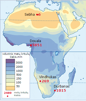 Per televiziją dažnai rodomi reportažai iš skirtingų Žemės vietų. Vienur problemų žmonėms kelia negausėjanti kaitra ir užsitęsiančios sausros. Kitur pliaupia nesibaigiančios liūtys. Taip yra todėl, kad krituliai mūsų planetoje pasiskirsto nevienodai. Tuo įsitikinti galima panagrinėjus Afrikos vidutinio metų kritulių pasiskirstymo žemėlapį.