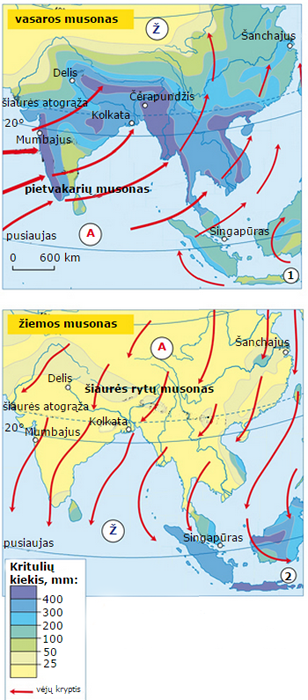 Žiemą sausuma greit atvėsta. Virš jos susidaro didelė aukšto slėgio sritis. Per vasarą įšilęs vandenynas vėsta lėčiau, todėl virš jo susiformuoja žemo slėgio sritis. Dėl slėgio skirtumų vėjas keičia kryptį ir pučia iš sausumos vandenynų link. Toks vėjas vadinamas žiemos musonu.