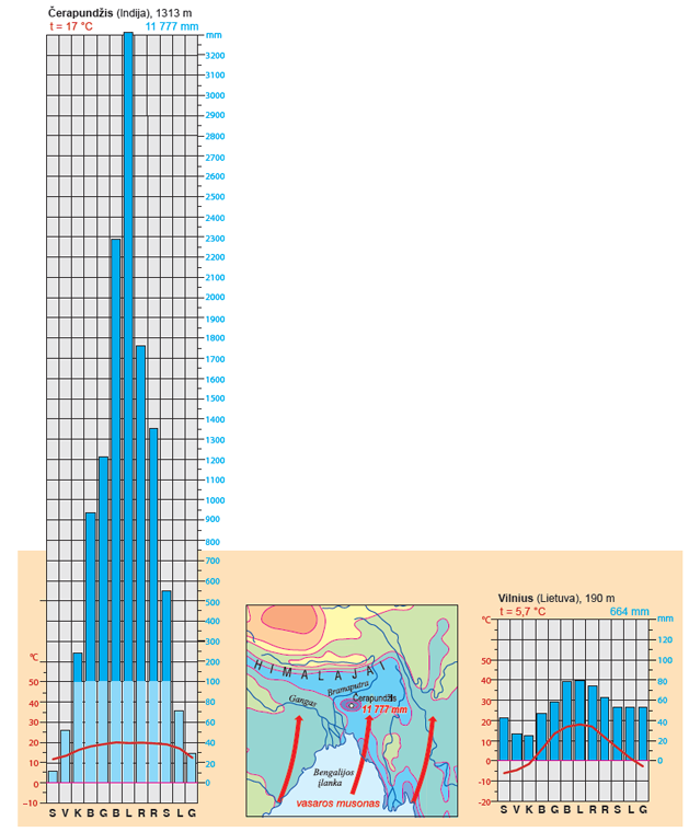 Kodėl čia tokia lietinga vieta? Tai lemia vasaros musonas ir Himalajų kalnai. Vasarą musonas iš Indijos vandenyno pučia į šiaurę ir sutinka kliūtį – didingus Himalajus. Kelis mėnesius Čerapundžio apylinkėse pliaupia lietūs. Patvinsta visos šio krašto upės. Jos dažnai išsilieja iš krantų ir padaro daug žalos gyventojams. Dėl gausių kritulių pietiniuose Himalajų šlaituose labai veši augalija.