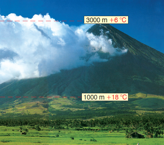 Kalnų klimatas labai skiriasi nuo aplinkinių lygumų klimato. Pirmiausia kalnuose yra vėsiau, o kuo jie aukštesni, tuo šis skirtumas didesnis. Neaukštai virš jūros lygio esančiose lygumose temperatūra būna aukščiausia. Kildamas aukštyn oras retėja, vėsta, jo temperatūra krinta. Vidutiniškai kas 1 km oro temperatūra nukrinta apie 6 °C. Pavyzdžiui, kalnų papėdėje ji siekia +24 °C, o 3000 m aukštyje bus tik +6 °C. Pakilus į 5000 m aukštį, nukris net iki –6 °C.