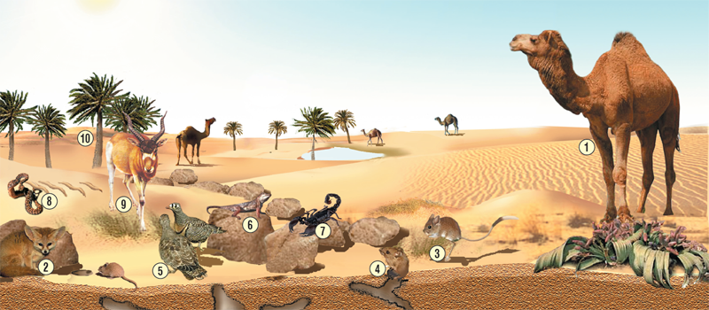 Nors dykumoje mažai iškrinta kritulių, stipriai šviečia Saulė, čia yra augalų ir gyvūnų. Dykumų augalija skurdi, o kai kur jos visai nėra. Kadangi dykumose labai karšta, augalų lapai smulkūs, kartais virsta dygliais. Kai kurių augalų šaknys giliai įsiskverbia į žemę ir pasiekia gruntinį vandenį.