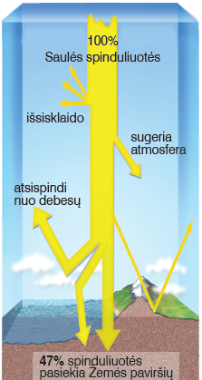 Nemažą energijos dalį sulaiko atmosfera, nes pro ją eidami spinduliai išsisklaido. Apniukusiu oru Žemės paviršių pasiekia tik išsklaidytieji spinduliai. Atvirkščiai būna giedrą dieną. Tada sakoma, kad į Žemę patenka tiesioginiai spinduliai.