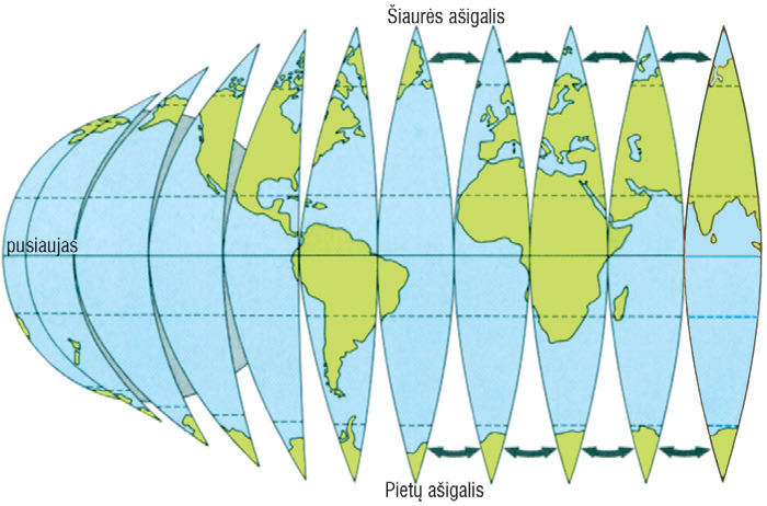 Išgaubtą paviršių galima ir kitu būdu perkelti ant lygaus. Tam galima gaublį per dienovidinius supjaustyti siauromis juostelėmis ir jas sudėti ant popieriaus lapo vieną greta kitos. Per vidurių juosteles bus susiglaudusios, o viršutinėje ir apatinėje dalyje atsiras platėjančių tarpelių. Toks žemėlapis yra nepilnas, todėl tie tarpeliai tarp juostelių užpildomi. Šiose žemėlapių vietose yra akivaizdžių netikslumų.